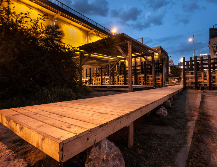 Culture Shack is a sustainably designed pavilion created for the Mikser Festival in Belgrade’s historic Savamala district. Constructed with reclaimed materials, its modular form not only activates the riverfront but also integrates a new pedestrian crossing over the railway—merging architecture, infrastructure, and public space into one cohesive design.
